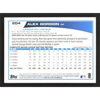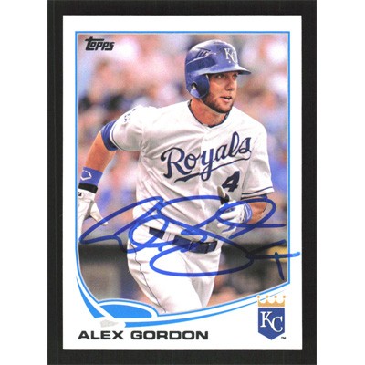 This is a 2013 Topps Alex Gordon autographed baseball card. This card has been signed, in blue, by Alex Gordon, and is guaranteed authentic by Ballcardz.com. The card is #204 and pictures show condition.