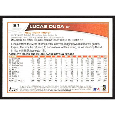 This is a 2013 Topps Lucas Duda baseball card. The card is #21 and pictures show condition.