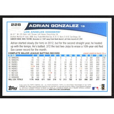 This is a 2013 Topps Adrian Gonzalez baseball card. The card is #228 and pictures show condition.