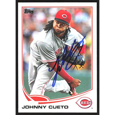 This is a 2013 Topps Johnny Cueto autographed baseball card. This card has been signed, in blue, by Johnny Cueto, and is guaranteed authentic by Ballcardz.com. The card is #275 and pictures show condition.