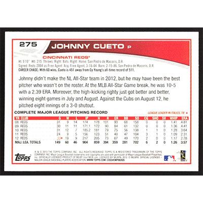 This is a 2013 Topps Johnny Cueto baseball card. The card is #275 and pictures show condition.