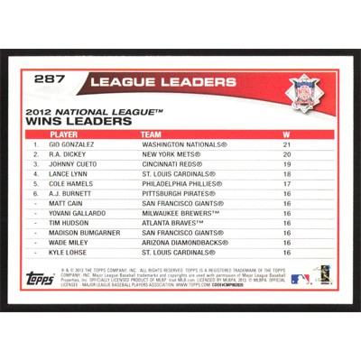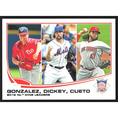 This is a 2013 Topps Gio Gonzalez, R.A. Dickey and Johnny Cueto League Leaders baseball card. The card is #287 and pictures show condition. Team(s): Washington Nationals/New York Mets/Cincinnati Reds
