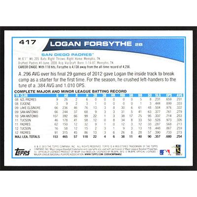 This is a 2013 Topps Logan Forsythe baseball card. The card is #417 and pictures show condition.