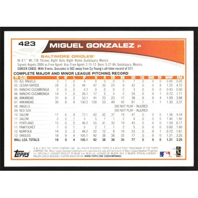 This is a 2013 Topps Miguel Gonzalez baseball card. The card is #423 and pictures show condition.