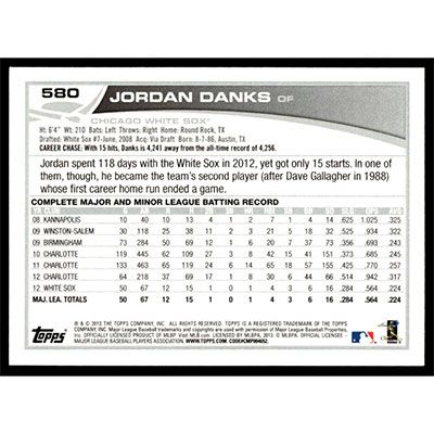 This is a 2013 Topps Jordan Danks baseball card. The card is #580 and pictures show condition.