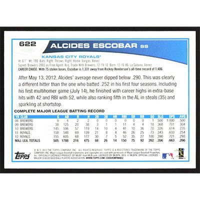 This is a 2013 Topps Alcides Escobar baseball card. The card is #622 and pictures show condition.