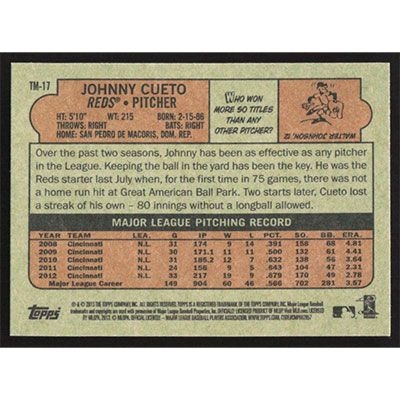 This is a 2013 Topps '72 Minis Johnny Cueto baseball card. The card is #TM-17 and pictures show condition.