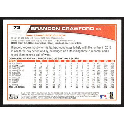 This is a 2013 Topps Brandon Crawford baseball card. The card is #73 and pictures show condition.