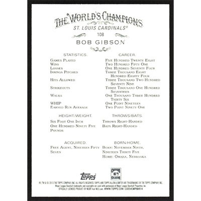 This is a 2013 Topps Allen & Ginter Bob Gibson baseball card. The card is #108 and pictures show condition.