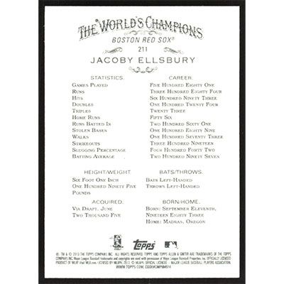 This is a 2013 Topps Allen & Ginter Jacoby Ellsbury baseball card. The card is #211 and pictures show condition.