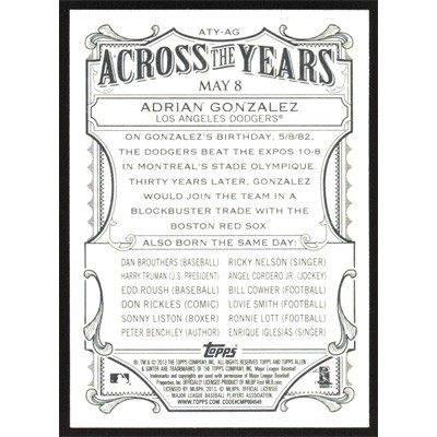 This is a 2013 Topps Allen & Ginter Across the Years Adrian Gonzalez baseball card. The card is #ATY-AG and pictures show condition. Team(s): Los Angeles Dodgers