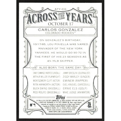 This is a 2013 Topps Allen & Ginter Across the Years Carlos Gonzalez baseball card. The card is #ATY-CG and pictures show condition. Team(s): Colorado Rockies