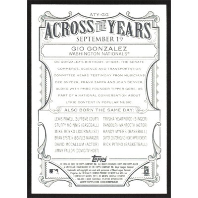This is a 2013 Topps Allen & Ginter Across the Years Gio Gonzalez baseball card. The card is #ATY-GG and pictures show condition. Team(s): Washington Nationals
