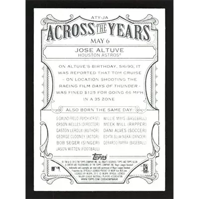 This is a 2013 Topps Allen & Ginter Across the Years Jose Altuve baseball card. The card is #ATY-JA and pictures show condition.