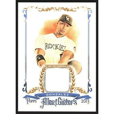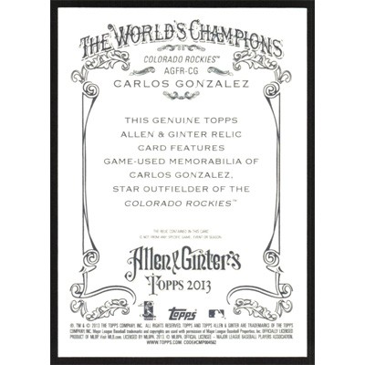 This is a 2013 Topps Allen & Ginter Relics Carlos Gonzalez Game-Used Jersey baseball card. The card is #AGFR-CG and pictures show condition. Team(s): Colorado Rockies