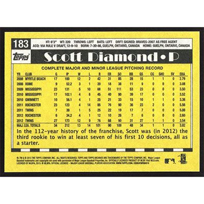 This is a 2013 Topps Archives Scott Diamond baseball card. The card is #183 and pictures show condition.