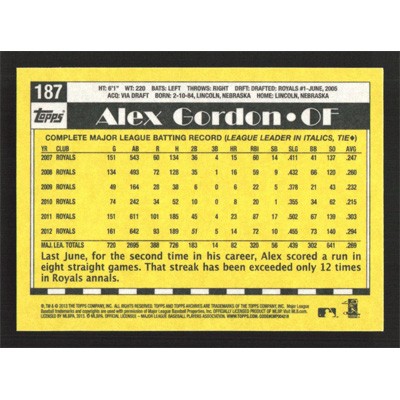 This is a 2013 Topps Archives Alex Gordon baseball card. The card is #187 and pictures show condition.