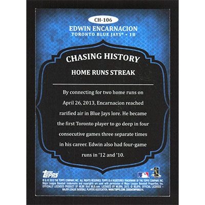 This is a 2013 Topps Chasing History Edwin Encarnacion baseball card. The card is #CH-106 and pictures show condition.
