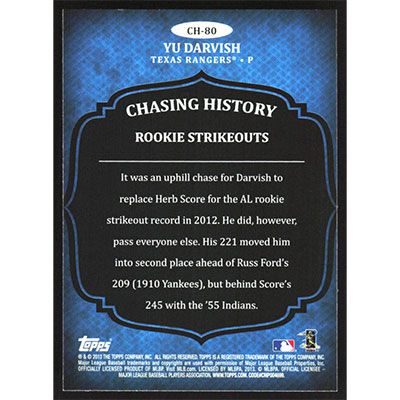 This is a 2013 Topps Chasing History Yu Darvish baseball card. The card is #CH-80 and pictures show condition.
