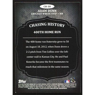 This is a 2013 Topps Chasing History Holofoil Adam Dunn baseball card. The card is #CH-30 and pictures show condition.