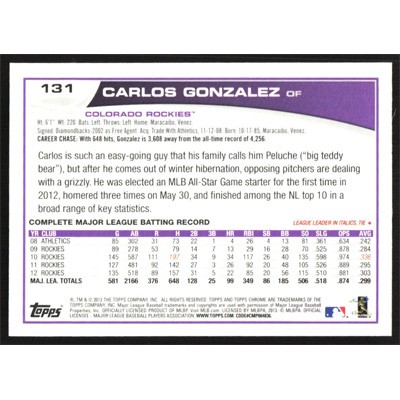 This is a 2013 Topps Chrome Carlos Gonzalez baseball card. The card is #131 and pictures show condition.