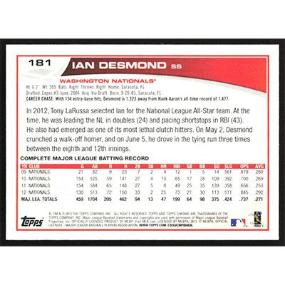 This is a 2013 Topps Chrome Ian Desmond baseball card. The card is #181 and pictures show condition.