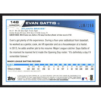 This is a 2013 Topps Chrome Blue Refractors Evan Gattis baseball card. The card is #148 and pictures show condition. This card is limited; #'d 118/199.