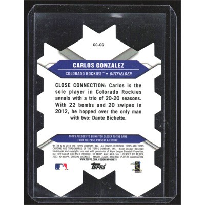 This is a 2013 Topps Chrome Chrome Connections Die Cuts Carlos Gonzalez baseball card. The card is #CC-CG and pictures show condition. Team(s): Colorado Rockies
