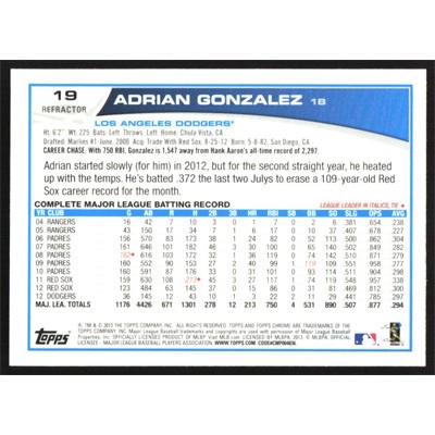 This is a 2013 Topps Chrome Orange Refractors Adrian Gonzalez baseball card. The card is #19 and pictures show condition.