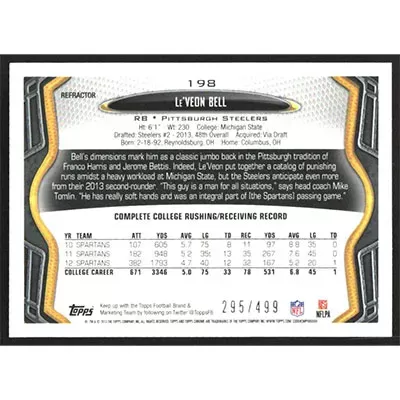 This is a 2013 Topps Chrome Purple Refractors Le'Veon Bell football card. The card is #198 and pictures show condition. This card is limited; #'d 295/499.