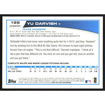 This is a 2013 Topps Chrome Refractors Yu Darvish baseball card. The card is #199 and pictures show condition.
