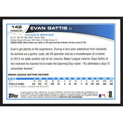 This is a 2013 Topps Chrome X-Fractors Evan Gattis baseball card. The card is #148 and pictures show condition. Team(s): Atlanta Braves Rookie Card (RC)