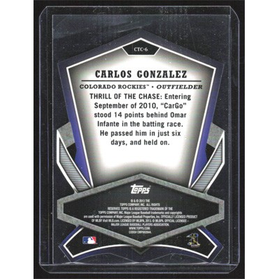 This is a 2013 Topps Cut to the Chase Carlos Gonzalez baseball card. The card is #CTC-6 and pictures show condition.
