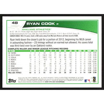 This is a 2013 Topps Emerald Ryan Cook baseball card. The card is #48 and pictures show condition.