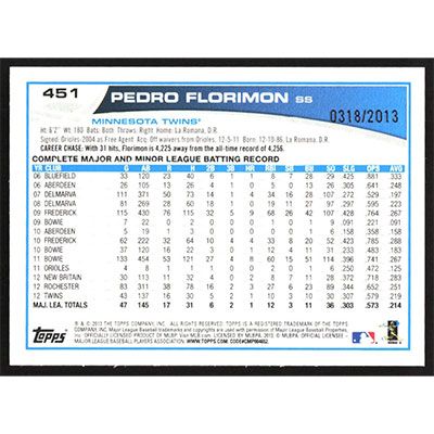 This is a 2013 Topps Gold Pedro Florimon baseball card. The card is #451 and pictures show condition. This card is limited; #'d 0318/2013. Team(s): Minnesota Twins