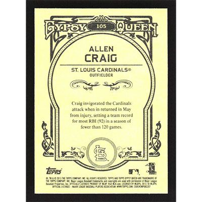 This is a 2013 Topps Gypsy Queen Allen Craig baseball card. The card is #105 and pictures show condition.