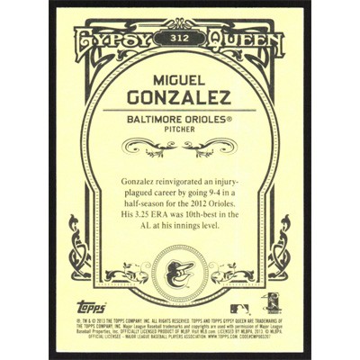 This is a 2013 Topps Gypsy Queen Miguel Gonzalez baseball card. The card is #312 and pictures show condition.