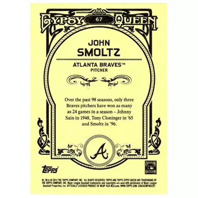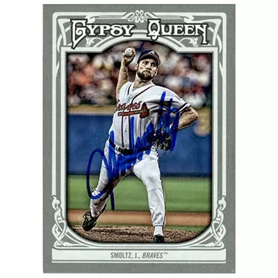 This is a 2013 Topps Gypsy Queen John Smoltz autographed baseball card.This card is signed, in blue, by John Smoltz, and is guaranteed authentic by Ballcardz.com. The card is #67 and is in NM-MT condition.