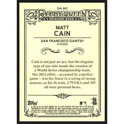This is a 2013 Topps Gypsy Queen Dealing Aces Matt Cain baseball card. The card is #DA-MC and pictures show condition.