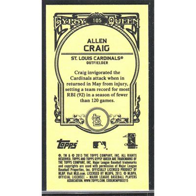 This is a 2013 Topps Gypsy Queen Mini Allen Craig Short Print Variation baseball card. The card is #105 and pictures show condition. Team(s): St. Louis Cardinals