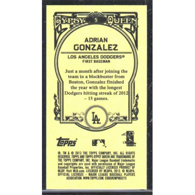 This is a 2013 Topps Gypsy Queen Mini Adrian Gonzalez baseball card. The card is #5 and pictures show condition.