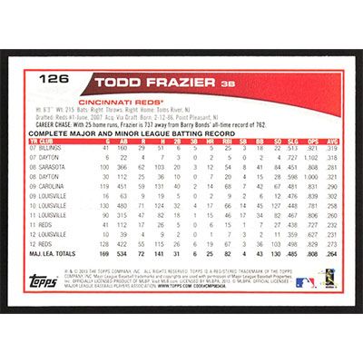 This is a 2013 Topps Opening Day Todd Frazier baseball card. The card is #126 and pictures show condition.