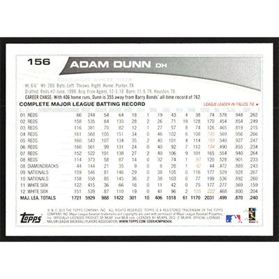 This is a 2013 Topps Opening Day Adam Dunn baseball card. The card is #156 and pictures show condition.