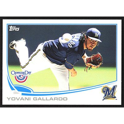 This is a 2013 Topps Opening Day Yovani Gallardo baseball card. The card is #21 and pictures show condition.