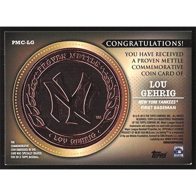 This is a 2013 Topps Proven Mettle Coins Copper Lou Gehrig baseball card. The card is #PMC-LG and pictures show condition. This card is limited; #'d 12/99.