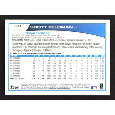 This is a 2013 Topps Silver Slate Blue Sparkle Wrapper Redemption Scott Feldman baseball card. The card is #39 and pictures show condition. Team(s): Texas Rangers