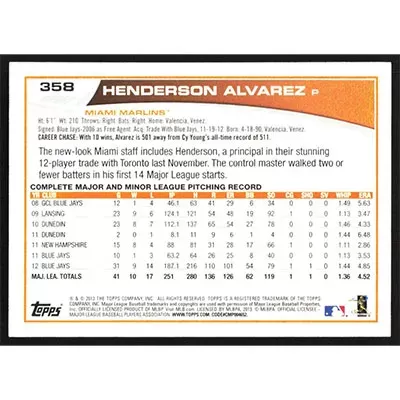 This is a 2013 Topps Target Red Henderson Alvarez baseball card. The card is #358 and pictures show condition.