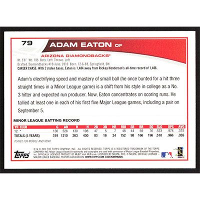 This is a 2013 Topps Toys 'R Us Purple Adam Eaton baseball card. The card is #79 and pictures show condition. Team(s): Arizona Diamondbacks Rookie Card (RC)