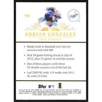 This is a 2013 Topps Tribute Adrian Gonzalez baseball card. The card is #98 and pictures show condition.