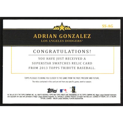 This is a 2013 Topps Tribute Superstar Swatches Blue Adrian Gonzalez Game Used Dual Jersey baseball card. The card is #SS-AG and pictures show condition. This card is limited; #'d 15/50.